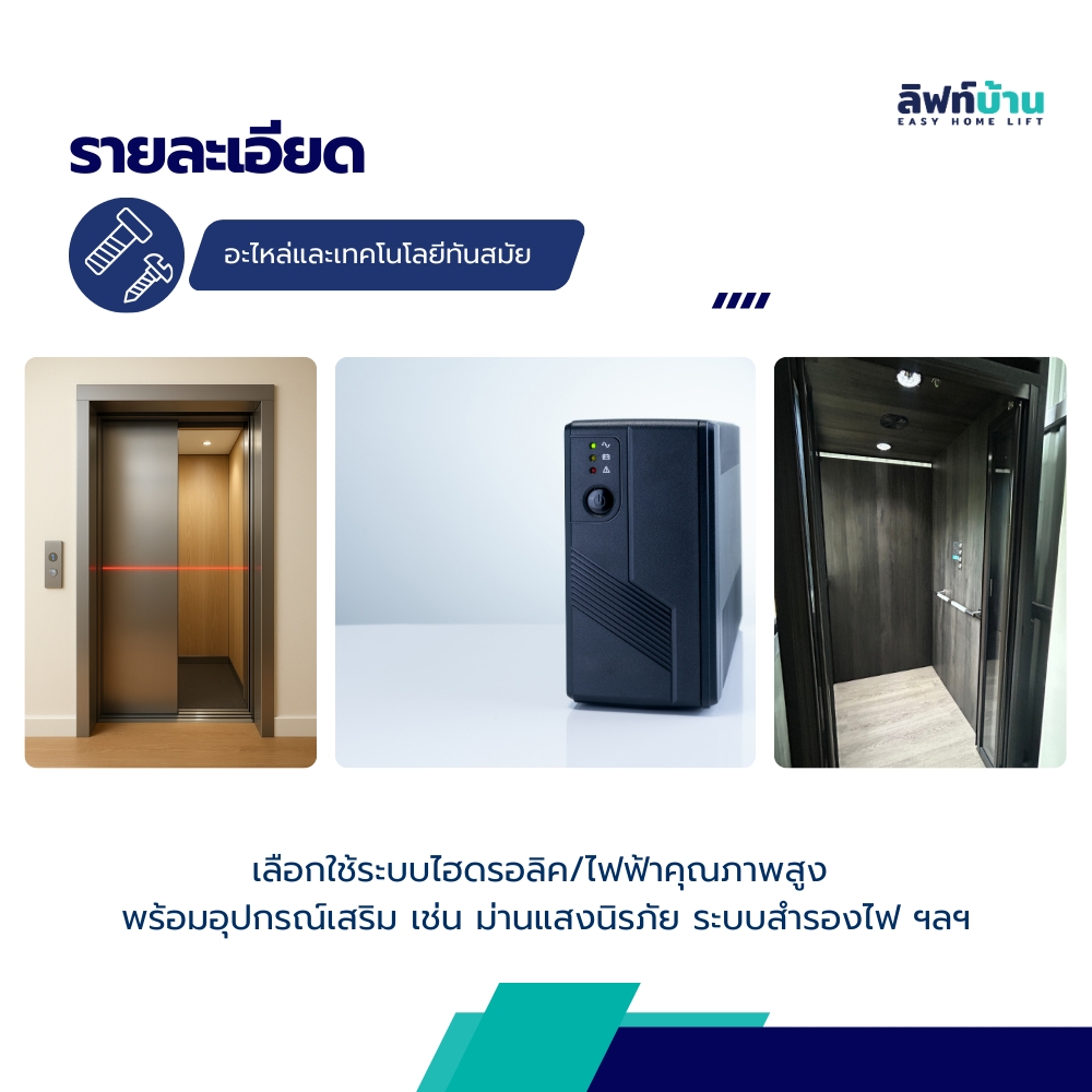 ลิฟท์ระบบไฮดรอลิกไม่จำเป็นต้องมีโครงสร้างซับซ้อน ทำให้ติดตั้งได้รวดเร็ว ใช้พื้นที่น้อย เหมาะกับบ้านที่มีข้อจำกัดด้านพื้นที่