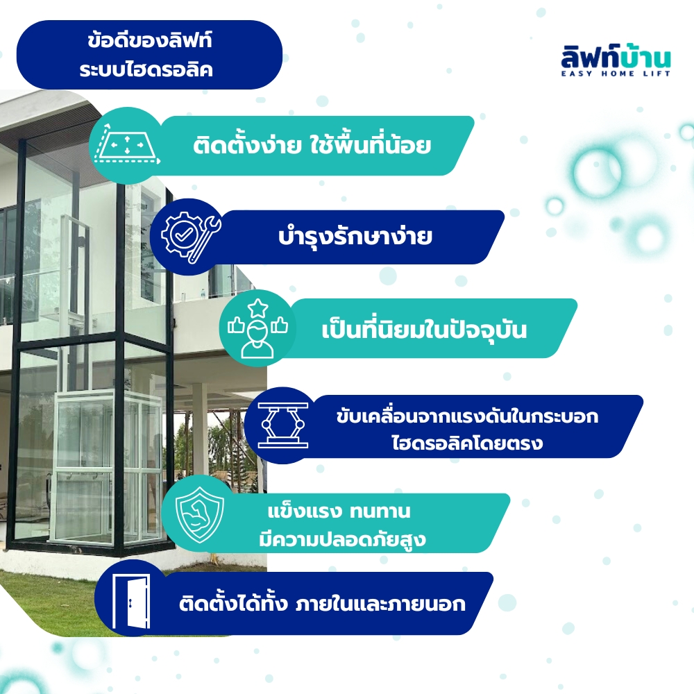 ลิฟท์ระบบไฮดรอลิกไม่จำเป็นต้องมีโครงสร้างซับซ้อน ทำให้ติดตั้งได้รวดเร็ว ใช้พื้นที่น้อย เหมาะกับบ้านที่มีข้อจำกัดด้านพื้นที่